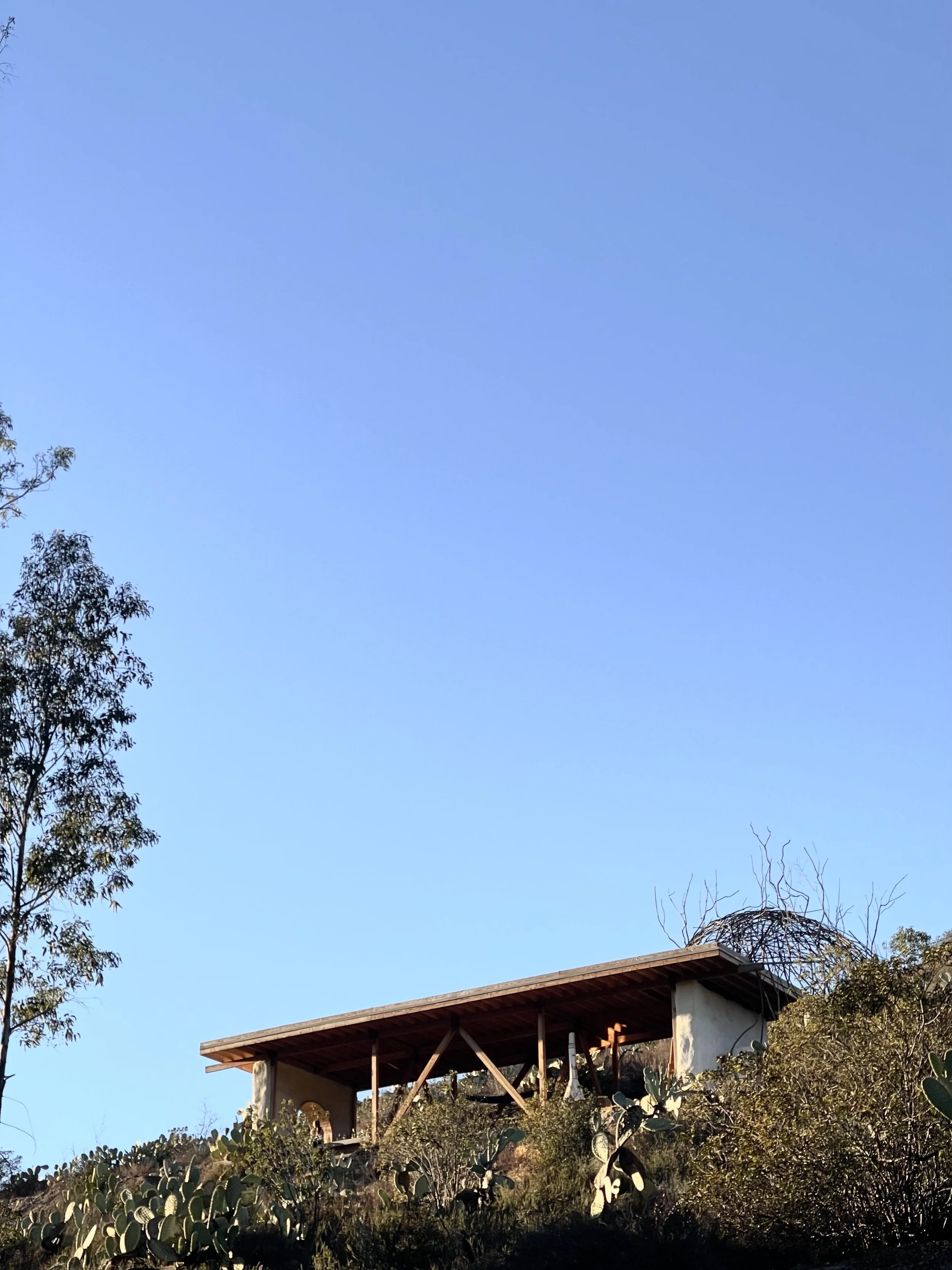 Construction System Wheat Straw Bales, Wood Beams, Clay Pavers, Poured Concrete and Tree Branches.